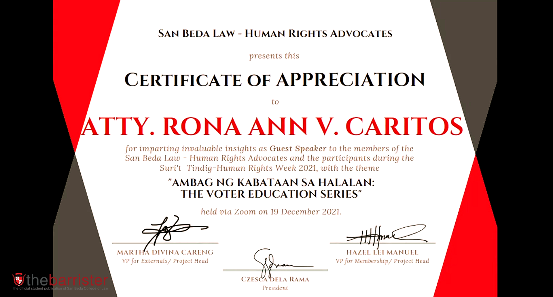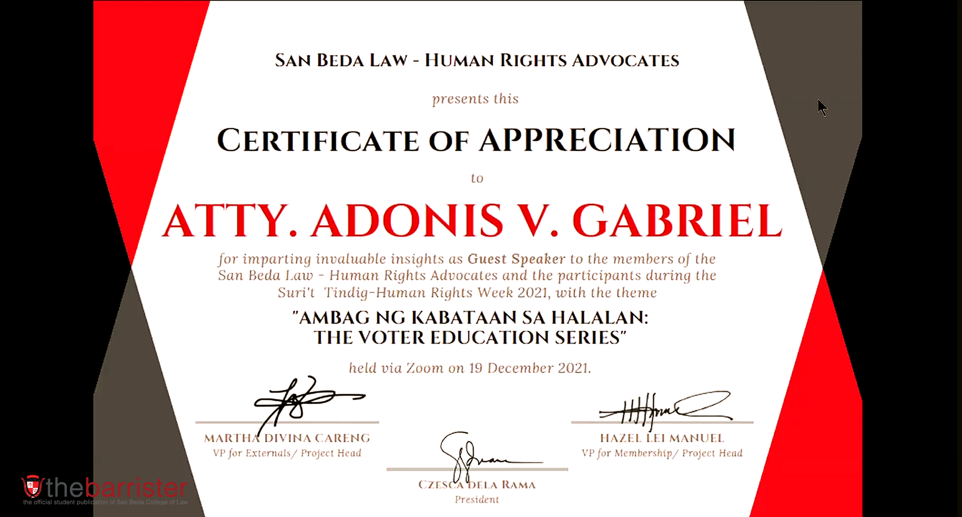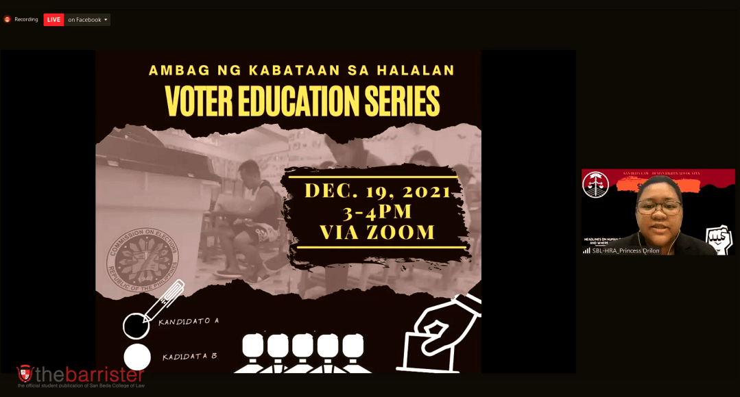 San Beda College of Law-Human Rights Advocates’ Suri’t Tindig series highlighted today the power of voter education for the upcoming May 2022 elections.