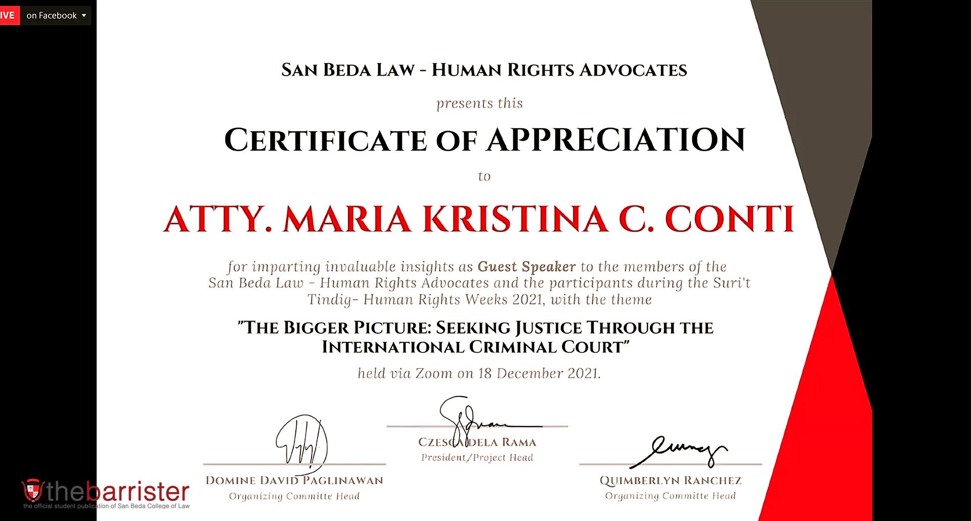 Atty. Maria Kristina “Krissy” Conti, another human rights advocate, meanwhile, gave an overview on the ICC investigation on President Duterte’s “war on drugs.”
