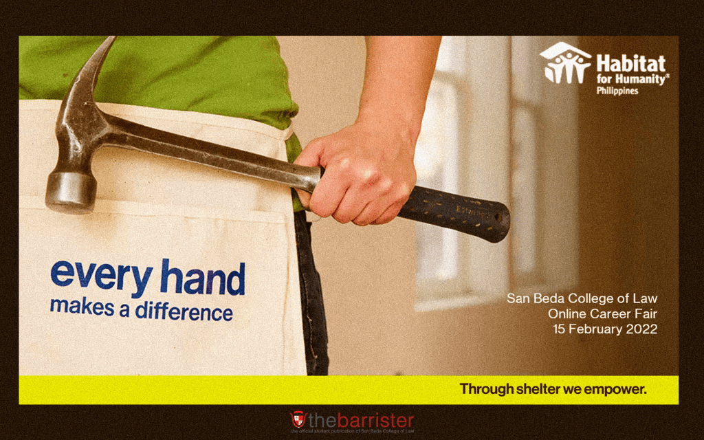 The last speaker for the career fair was Ms. Ariane Alligayu of Habitat for Humanity. Habitat for Humanity is a non-governmental organization which aims to make housing more accessible and affordable, especially for low income families. Alligayu emphasized the NGOโs need for part-time legal assistants and paralegals who can help them in the various contracts that they are entering into with their partners from different sectors.