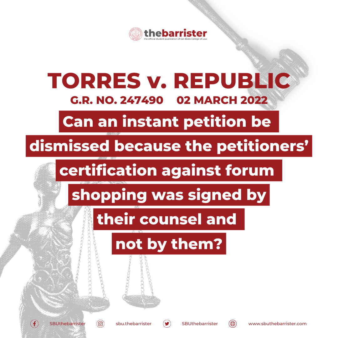 A petition was filed with the Court of Appeals that sought to have the Regional Trial Court’s judgment annulled, after the lower court ruled in a land title case to cancel certain derivative titles to which herein petitioners were the registered owners, on the ground that petitioners Torres were not parties to the proceedings conducted as they were all living and working abroad. The land title case stemmed from a 1999 complaint filed by herein respondents against Spouses Leonora and Florencio Gaspar, who are not parties to the instant case. The CA dismissed the petition as well as the subsequent motion for reconsideration. Hence, the instant petition for review on certiorari, where petitioners asserted the CA was wrong in invoking the doctrine of stare decisis, after the latter alleged that the present petition should be dismissed due to the procedural issue that it was the petitioners’ counsel who signed the Certificate of Non-Forum Shopping, not the petitioners themselves.