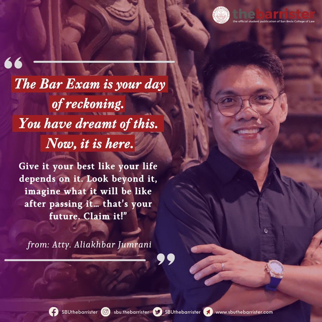 “The Bar Exam is your day of reckoning. You have dreamt of this. Now, it is here. Give it your best like your life depends on it. Look beyond it, imagine what it will be like after passing it… that’s your future. Claim it!” – Atty. Aliakhbar Jumrani